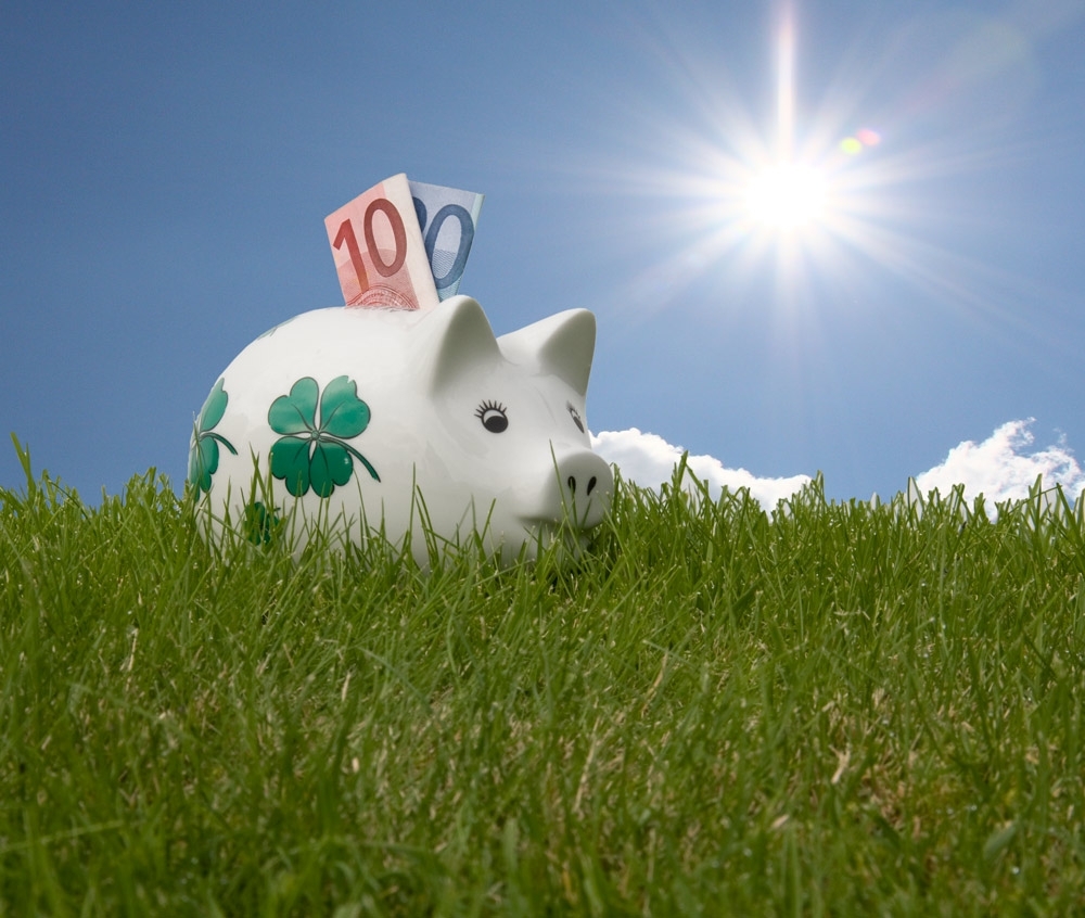 Foto "Sparschwein im Grünen mit 30 Euro" 1000 x 846 Pixel